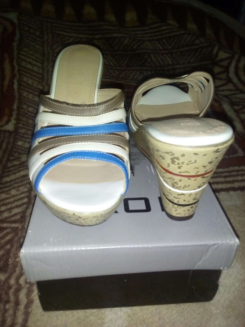р-р 40 по стельке 25см., цвет белый с бурым и бирюзовым (вместо черной полосы на фото ярко-голубая) Очень хорошенькие. Мне маловато.